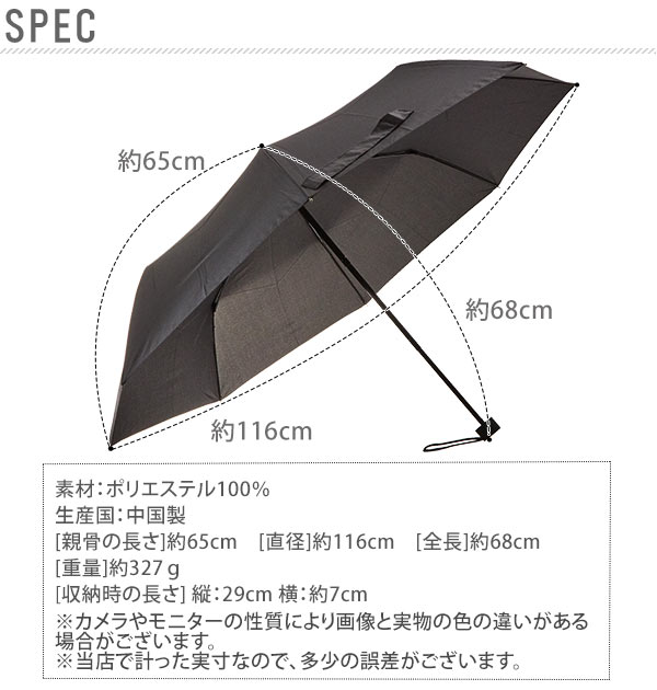 素材ポリエステル100%生産国中国サイズ[親骨の長さ]約65cm [直径]約116cm [全長]約68cm 収納時[縦]約29cm[横]約7cm※サイズは当店平置き実寸サイズです。